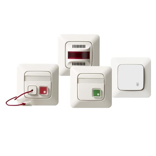 Jussi SET contains the following signalling products: 1 pc Transformer FLM1000, 1 pc 1-loop Alarm Unit FEH2001, 1 pc Signal Push Button with Draw Cord FAP3002 (calling) and 1 pc Signal Push Button FAP2001 (cancelling). All devices are equipped with coverframes 2511