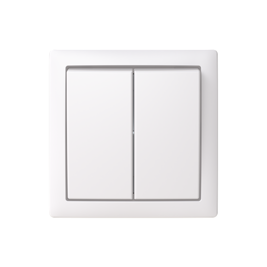 Two-gang two-way (6+6) switch for surface mounting with screwless terminals. The terminals are for max 2 solid or rigid wires. Including switch insert, rocker, surface mounting frame and bottom. Bio-circular plastics used in the bottom and centre plate.