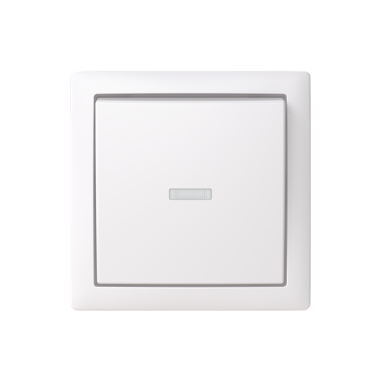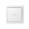Surface mounting push switch with transparent lens, screwless terminals and rocker with clip-on fastening. The terminals are for max 2 rigid wires. Bio-circular plastics used in the bottom and centre plate.