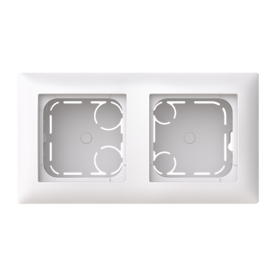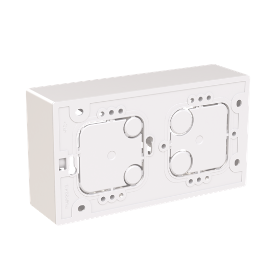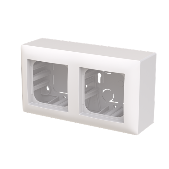 Surface mounting box for a 2-gang unit for 85 mm width. This box is high, with a total height of 53 mm. This box is suitable for devices with maximum installation depth of 36 mm. The unit consists of bottom plate and upper part. Bio-circular plastics used in the bottom and centre plate.