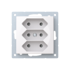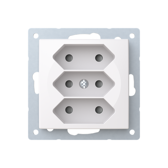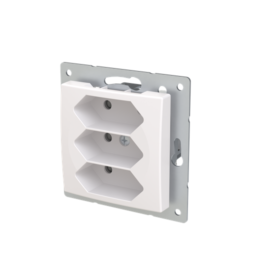 3-gang Euro socket outlet with center plate. There are terminals for each contact of the socket outlet for max 4 rigid wires and 2 X-terminals for 2-rigid wires. The socket outlet insert without the cover plate is screen-protected. Bio-circular plastics used in the centre plate.