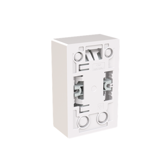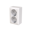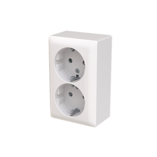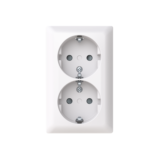 Double socket outlet with terminals for each contact of the socket outlet for max 4 rigid wires. Safety+ featured in the insert. Bio-circular plastics used in the bottom and centre plate.