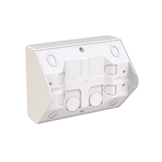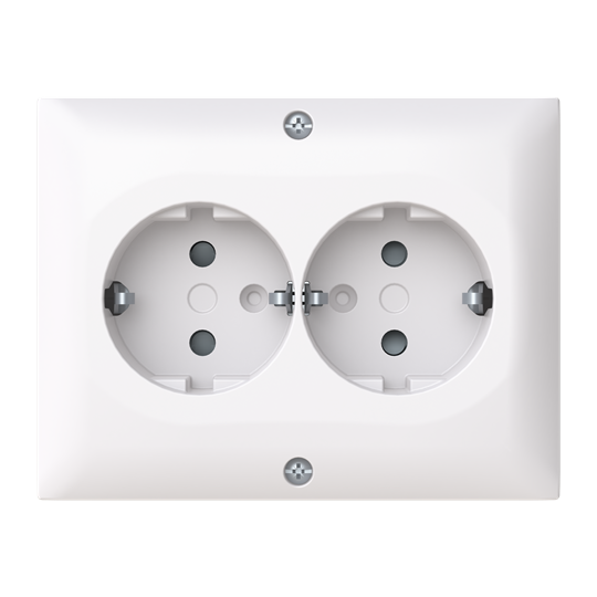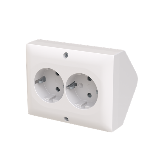 Two gang socket outlet fitted in a corner box. Schuko interface with terminals for each contact of the socket outlet for max 4 rigid wires. Bio-circular plastics used in the bottom and centre plate.