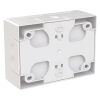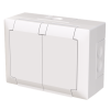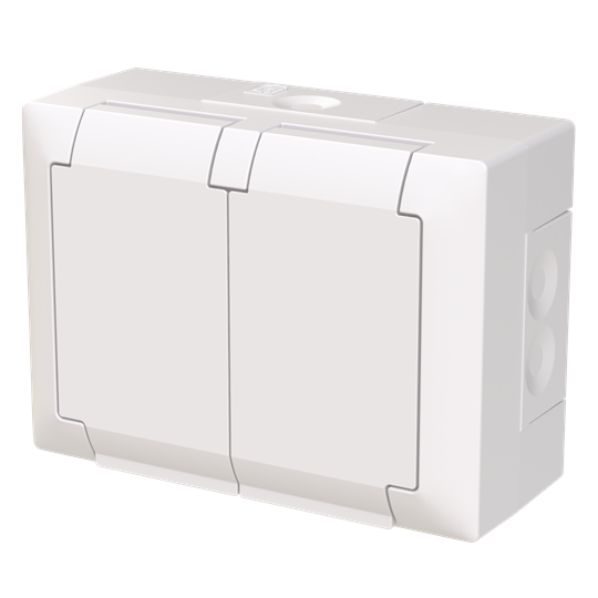 Surface mounting IP44 double socket outlet with terminals for each contact of the socket outlet for max 4 rigid wires. IP44 when lids are closed and installed horizontally (lids opening upwards). The lids are kept closed with a return spring when socket outlet is not in use. Bio-circular plastics used in the centre plate, lids and bottom plate.