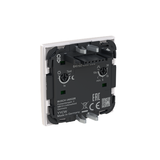 Movement detector sensor with measurement of ambient light. For automatic switching of devices dependent on motion and brightness. Push switch function possible at all times. ./. In combination with dimmer insert flex: dimming function of lighting and selectable light value storage. With enabling of pre-warning of switch-off for stairwell operation. Compatible with all free@home flex inserts. Adjusting elements on rear side. Extension of the detection range by means of master/slave combination. With continuous light/continuous Off function. With brightness-independent test mode for evaluating the detection zone. With detection display in test mode. Surveillance density: 14 sectors with 56 switching segments. Switch-off delay: approx. 10 sec - 30 min or short-time pulse 1 sec adjustable. For relay insert flex, 1gang, 64811 U. For e-contact insert flex, 1gang, 64814 U. For series relay insert flex, 2gang, 64821 U. For LED touch dimmer insert flex, 1gang, 64851 U. For extension insert flex, 64891 U. Mounting height: 22 mm.