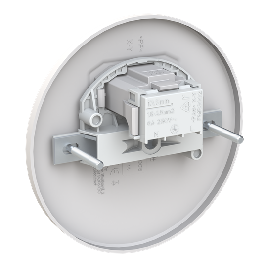 Ceiling rose AKK14 is an earthed, bipolar class 1 ceiling rose. AKK14 crown cover can be mounted onto the junction box. The group cables, 2,5 mm² (-o-), may be continued. Each ceiling rose can carry a max. 6 A 250 V lighting appliance up to the weight of 15 kilos.