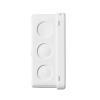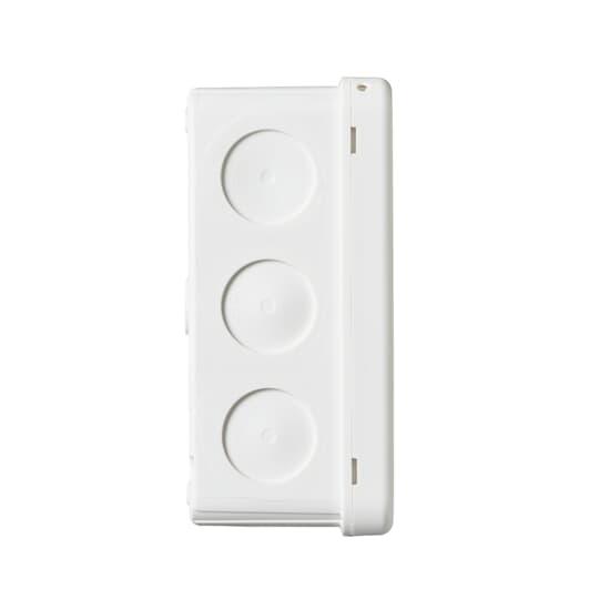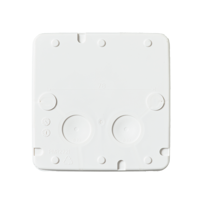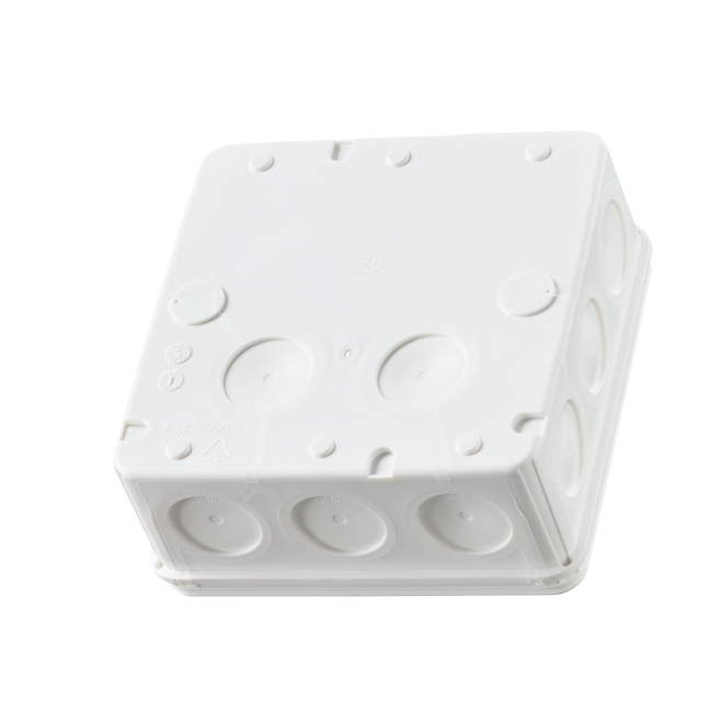 The square junction box AP10 (6,0 mm², 500 V) is equipped with 12 membrane cable entries (Ø 19 mm) in the sides, and two on the bottom. Cables are easy to connect by simply inserting the stripped ends through the inlets. The box locks by snapping and can be opened by inserting a screwdriver (for example) into the opening slots - no screws are needed. The box can be furnished with strain-reliefs AS9.10, AS9, AS9.1 and AS9.3. Mounting temperature -25...+60 °C. Made of halogen free material (IEC/61249-2-21)