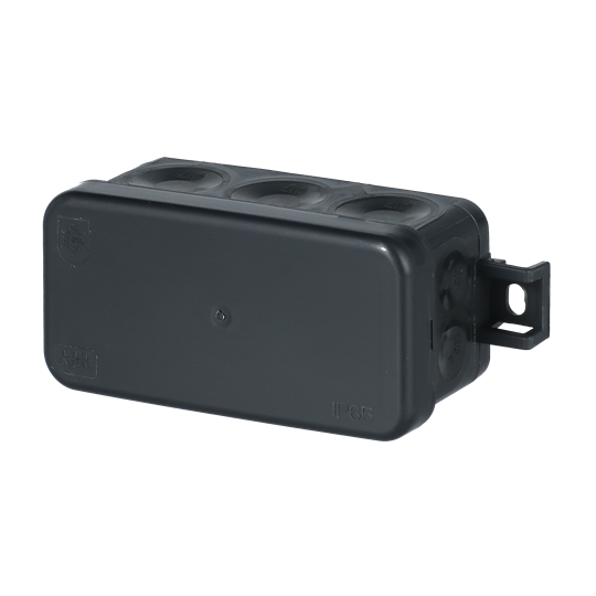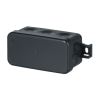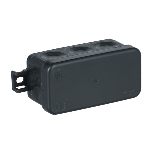 Junction box AP45 (2,5 mm², 500 V) is equipped with 10 self-sealing membrane cable entries for cables up to Ø 17 mm and 4 for cables up to Ø 10 mm. The membranes enable easy cable installation by simply inserting the stripped ends through the inlets. The junction box has IP65 protection rating (also after installing the cables). Cover locks by snapping and can be opened by inserting a screwdriver (for example) into the opening slots - no screws are needed. The junction box size is 105x43x40 and it has external fastening points on both sides. The box can be furnished with strain-relief AS9.10. Mounting temperature -25...+60 °C. Made of halogen free material (IEC/61249-2-21). Hard plastic parts are manufactured from recycled plastic. Color black.