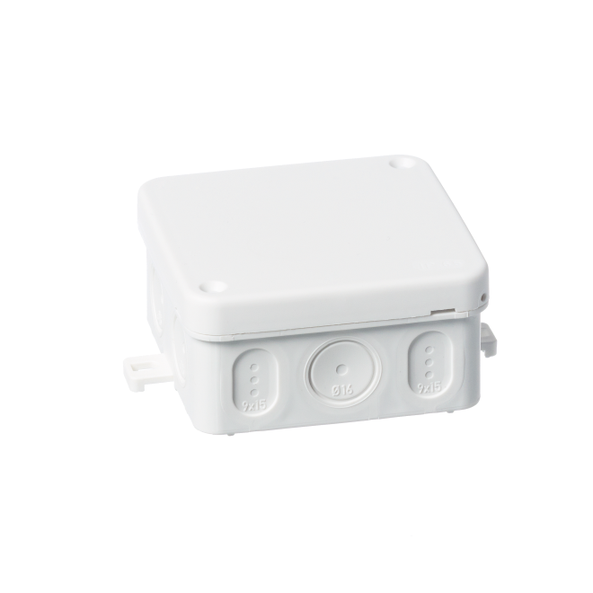 The AP75 junction box (2,5 mm², 450 V) is equipped with fixed, two-component membranelid cable entries, 10 in the sides and three on the bottom. It has a stiff frame (75 x 75 mm). Suitable for cables up to Ø 18. The locks box by snapping and can be opened by inserting a screwdriver into the opening slots. Pull-out brackets make it possible to mount it to a conductive base. The box can also be sealed. Mounting temperature -15...+60 °C. Made of halogen free material (IEC/61249-2-21).
