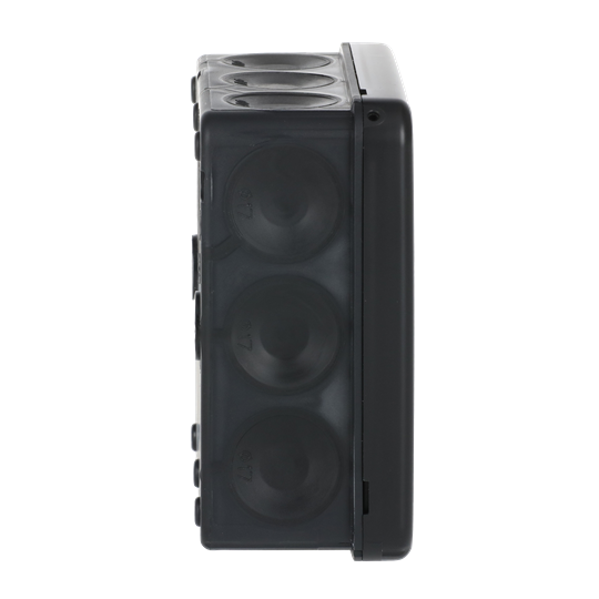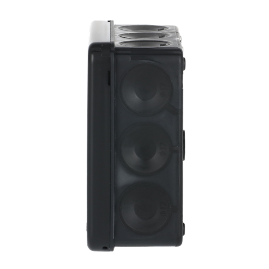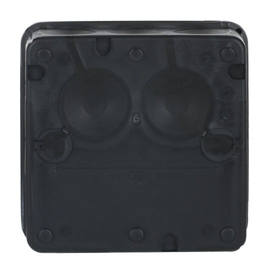 The square junction box AP9M (2,5 mm², 500 V) is equipped with 12 membrane cable entries (Ø 17 mm) in the sides, and two in the bottom. Cables are easy to connect by simply inserting the stripped ends through the inlets. The box locks by snapping and can be opened by inserting a screwdriver (for example) into the opening slots - no screws are needed. The box can be furnished with strain-reliefs AS9.10, AS9, AS9.1 and AS9.3. Fits Ø 6 - 15,5 mm cable. VDE-approved. Mounting temperature -25...+60 °C. Made of halogen free material (IEC/61249-2-21).