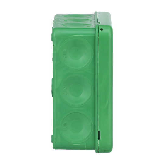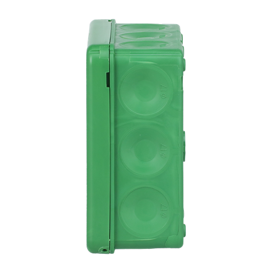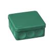 The square junction box AP9V (2,5 mm², 500 V) is equipped with 12 membrane cable entries (Ø 17 mm) in the sides, and two in the bottom. Cables are easy to connect by simply inserting the stripped ends through the inlets. The box locks by snapping and can be opened by inserting a screwdriver (for example) into the opening slots - no screws are needed. The box can be furnished with strain-reliefs AS9.10, AS9, AS9.1 and AS9.3. Fits up to Ø 17 mm cable. VDE-approved. Mounting temperature -25...+60 °C. Made of halogen free material (IEC/61249-2-21).