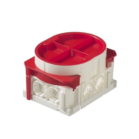 The box is mentioned for flat socket outlet ( for example 302EUJT ) installations with the flexible pipe. There is six knock outs for 16 mm pipes and two for the 20 mm pipe. In the bottom there is two knock outs for the bottom inlets. The mounting box includes two red half circles enabling installation on boards with a thickness of 12- 26 mm. Made of halogen free material (IEC/61249-2-21) and fulfills the requirements of the glow wire test according to the standard IEC/EN60670: 2005 (850 °C).